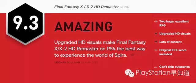 同时IGN也给游戏打出了9.3的高分,对10和10-2 2款经典宏大的游戏给予了肯定,PS4的高清画面、丰富的内容都是加分点,而不能跳过过场动画则成为减分的地方。