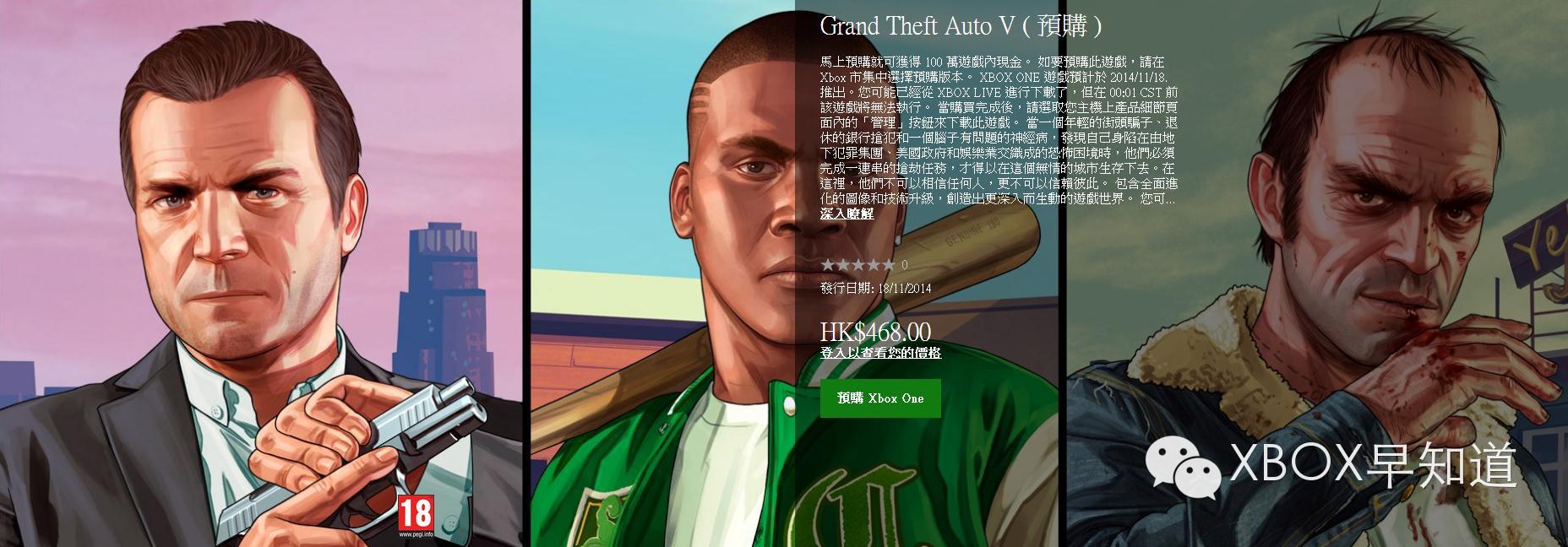 欢迎关注微信公众号今天XBOXONE版《GTA5》预载购买正式开放,港服售价为468港币(370RMB),美服售价为59.99美元。预购截止到11月18日,在此之前预购的玩家将得到价值为游戏内100万现金的预购奖励。《GTA5》的预载容量为43G。#XBOX早知道#