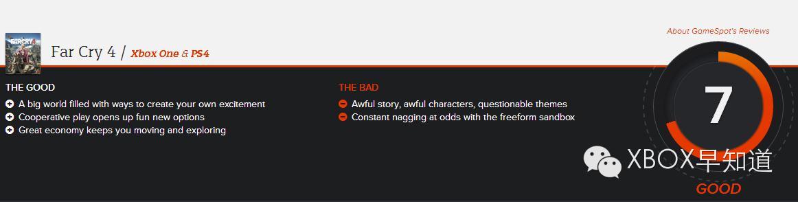 欢迎关注微信公众号《孤岛危机Farcry4》媒体评分出炉,保持了前作水准,但未能创造奇迹。《孤岛4》Meta综合评分为85分与前3作基本一致,IGN给出8.5分,Gamespot给出70分。媒体点评的优点:精美而神秘的世界,丰富的内容,PVP很不错;缺点:糟糕的人物,拖沓的剧情。尽管游戏素质保持中上水准,但是在发售时间和游戏方式上遭遇了《GTA5》的撞车,育碧真是有苦难言。#XBOX早知道#