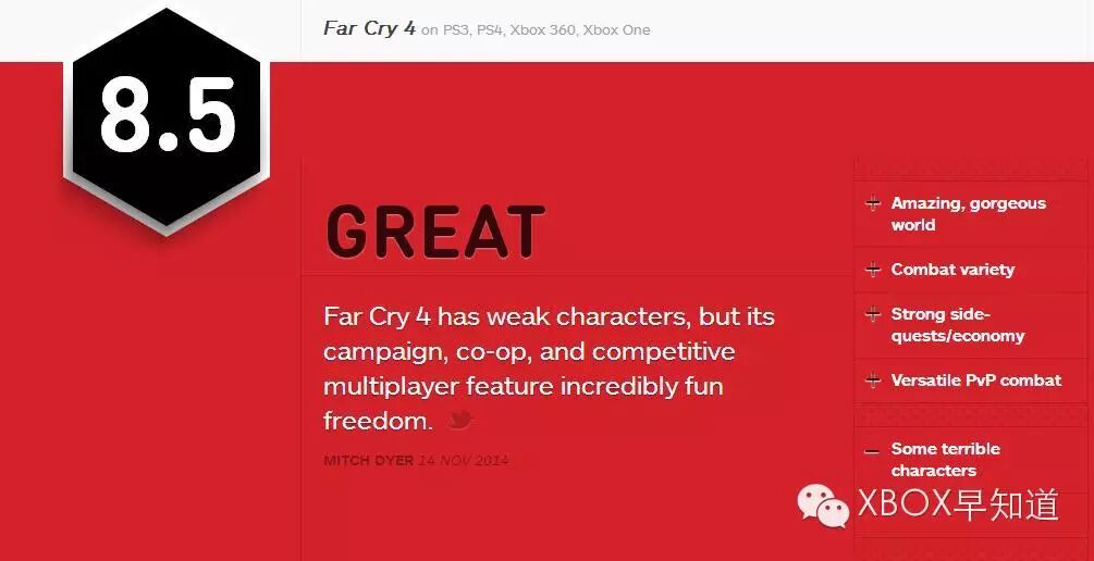 《孤岛危机Farcry4》媒体评分出炉,保持了前作水准,但未能创造奇迹。《孤岛4》Meta综合评分为85分与前3作基本一致,IGN给出8.5分,Gamespot给出70分。媒体点评的优点:精美而神秘的世界,丰富的内容,PVP很不错;缺点:糟糕的人物,拖沓的剧情。尽管游戏素质保持中上水准,但是在发售时间和游戏方式上遭遇了《GTA5》的撞车,育碧真是有苦难言。#XBOX早知道#