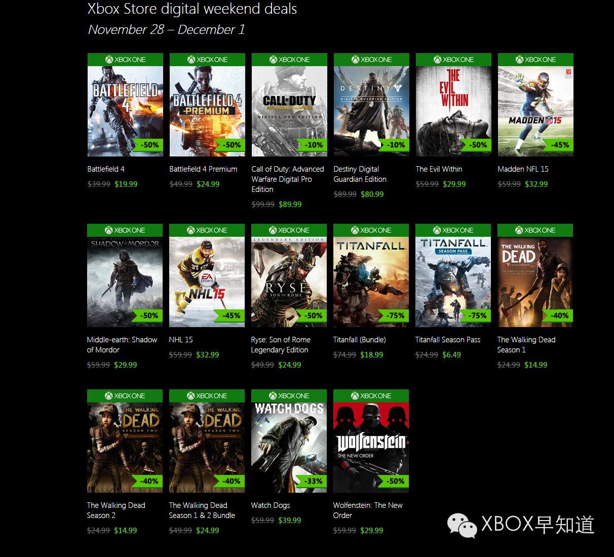 欢迎关注微信公众号11月28日-12月1日,黑5 XBOX限时特价泄露。这几天的优惠阵容相当不错,比现在的游戏阵容强很多。《Titanfall》35折,《战地4》《恶灵附身》《中土:暗影魔多》《罗马之子》5折,《看门狗》7折。不过目前该优惠暂时还未得到确认,但是可信度相当高,具体详见下图。同时本周金会员优惠的游戏还有《突击飞龙Strider》,该游戏5折优惠。#XBOX早知道#