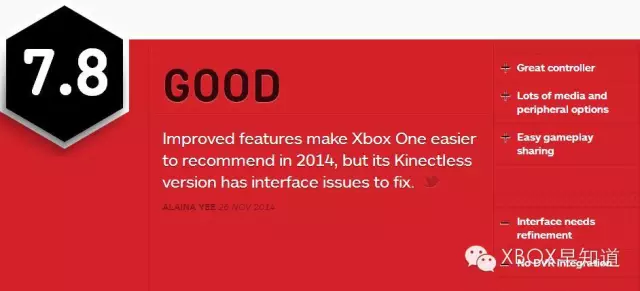 IGN时隔一年对XBOXONE主机再次进行了软硬件评测,带Kinect版XBOXONE评测从2013年发售时的7.8分提高到8.1分,新增了不带Kinect版的XBOXONE评测,普通版评分为7.8分。同时IGN也将PS4软硬件评分从8.2分提升到8.4分。X1在硬件的先天不足是一个硬伤,DVR功能功能和界面UI是主要的扣分点。而评分也正好符合目前2款主机的销量。#XBOX早知道#