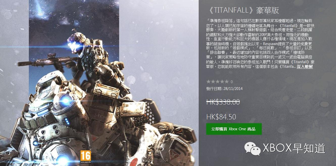在今天开始的新一批黑5游戏促销中,《Titanfall》豪华版并没出现在之前的宣传中, 但这次豪华版的价格比之前官方公布的本体和季票分开的折扣要更加给力。《Titanfall》豪华版仅售84.5港币,折合68RMB。(美服价格稍高12.5美元)。已经确定这个价格的确是豪华版,包括之前3个DLC。这个价格对于大家来说基本上就是同等于金会员免费赠送了。优惠绝对够给力,买不买就看大家了。目前游戏在美服的联机人气还不错,短时间不会出现鬼服的问题。#XBOX早知道#