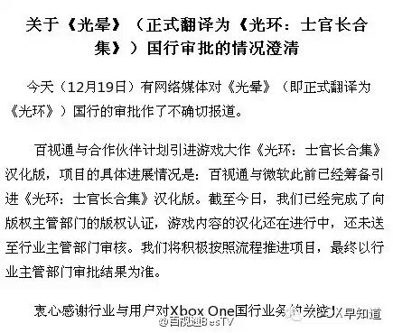 一直以来XBOXONE游戏提交审批的工作都是百视通和微软协调进行,而两者的分工截至目前所有玩家都不清楚,在国行《光环:士官长合集》前几天流产传言不绝于耳的情况下,百视通终于对游戏的审批进度给予了一次正面的官方回答。