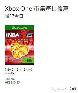 欢迎关注微信公众号XBOX新年限时特价第10天阵容公开,《NBA2K15》加15000 VC点数,今天75折,价格380港币,约300RMB。港服每天的优惠都早于美服,目前港服已经更新了今天的特价游戏,而美服《龙腾世纪:审判》的优惠还没结束。喜欢篮球的玩家可以毫不犹豫的入手了。#欢迎关注微信公众号“XBOX早知道”,搜索xboxzzd,并转发分享最新鲜实用的游戏资讯#