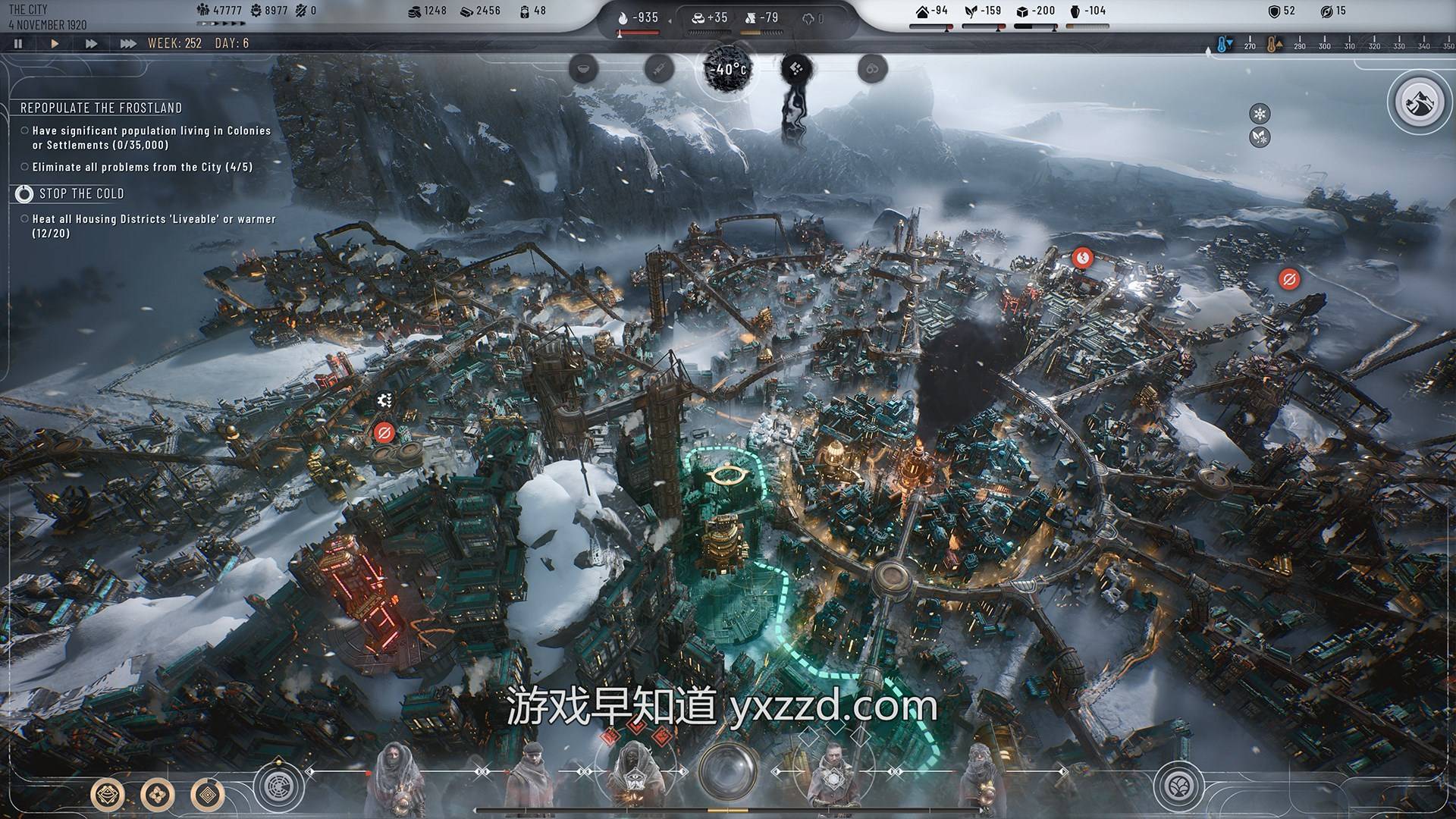 第二方面则是生存策略的模拟经营玩法,也就是玩家作为执政官需要让整个城市和人民在冰雪末日的极寒环境下生存下去,这方面关注的玩法就是城市的模拟经营,其中包括能源、食物、暖卷、劳动力、住房、污染、疾病等诸多方面的因素,玩家需要统筹利用好各方面的资源进行生产与分配,保证城市能够度过极寒白幕,并同时能够不断向外扩张,殖民霜地,为城市提供源源不断的资源供给。这一部分的核心玩法与前作是保持一致的。