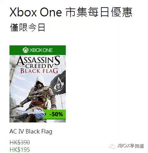 XBOX新年促销第14日限时特价公开,今天港服折扣游戏是《刺客信条:黑旗》。5折,售价195港币,约156 RMB ,不含DLC。目前这个价格是数字版的最低价,但光盘版在黑5期间的售价更低,毕竟是上一代的作品,没玩过该作的玩家可以入手体验下。