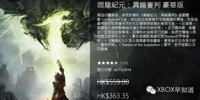 同时港服《龙腾世纪:审判》也在进行打折,且不需要金会员即可购买。普通版为278港币,豪华版为363港币。不过目前游戏没有中文,不要被介绍所误导。