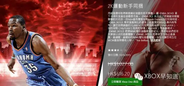 Xboxone版《2K运动新手同捆包》正式发布,目前是官方定价的6折进行销售,新手包包括《NBA2K15》、《WWE2K15》和《WWE WCW》DLC 一共是2款游戏,1个DLC包。该同捆港服售价616港币,约492RMB;美服为79.8美元,约496RMB。整体性价比相当高。
