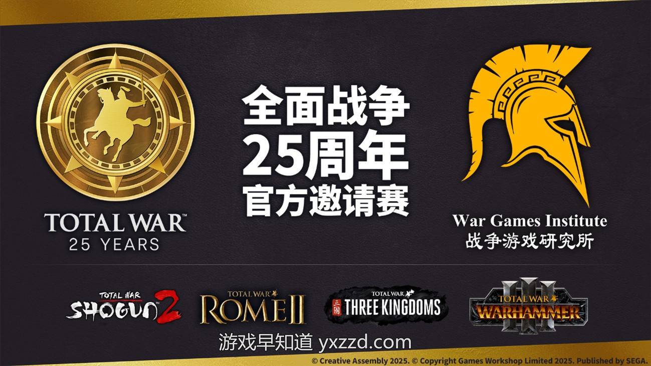 “全面战争25周年官方邀请赛”,是为纪念“全面战争”系列游戏发行25周年而举办的国内第一届官方赛事。本大赛特邀25位重量级主播加入,角逐《罗马2》、《幕府将军2》、《三国》以及《战锤3》4款《全面战争》经典项目冠军,1v1捉对厮杀,争霸“全战全能王”。