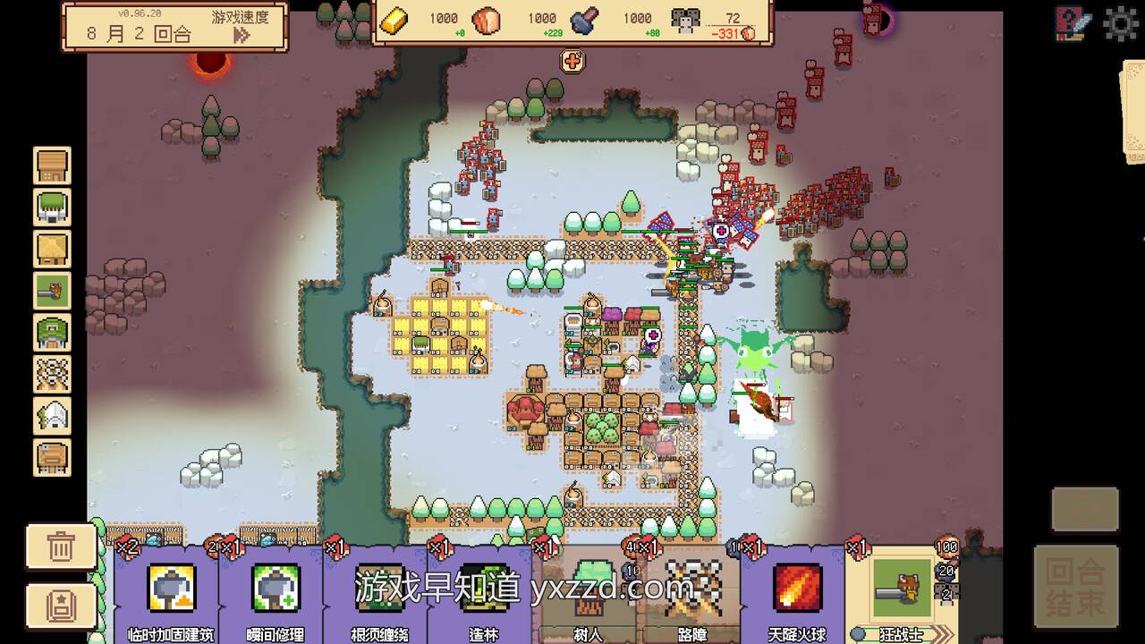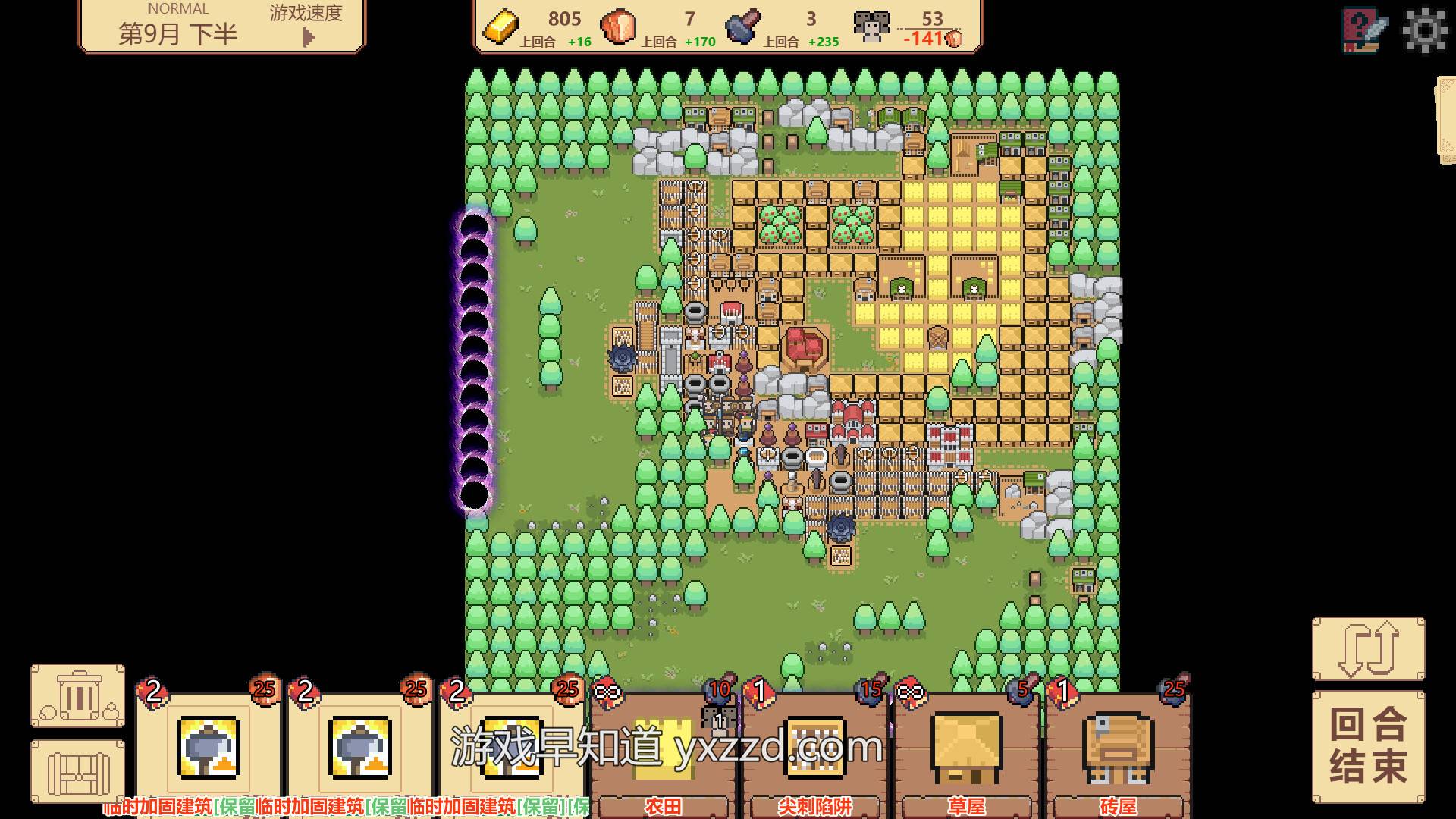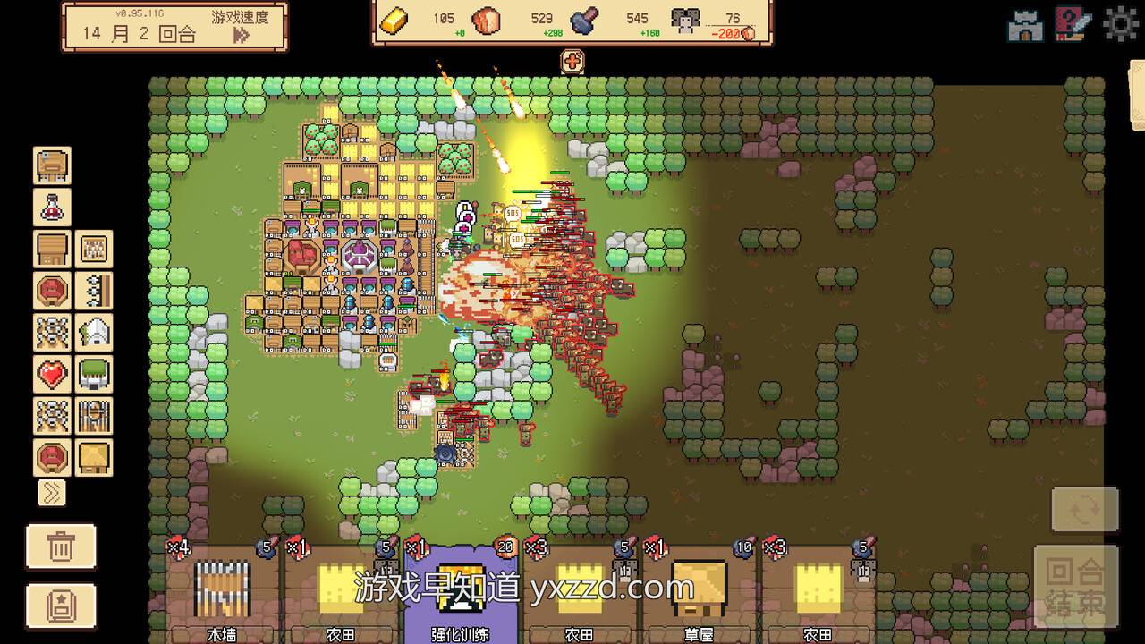 A:游戏整体分为两个部分:正常流程和无尽模式。因为是独立开发,精力比较有限,所以我把主要精力都集中在了正常流程部分的打磨上。得益于是回合制的结构,玩家每回合能获取多少资源,其实是可以预估的——这也让我们相对容易地估算出玩家在平均水平下的战斗力上限,进而安排对应的敌人强度。为了控制玩家的成长节奏,我重点做了人口上限和食物消耗这两个机制。人口上限要求玩家在前期做好战斗力和基础发展之间的平衡;而食物消耗机制则起到了“刹车”的作用,防止玩家无限制扩张,头上始终悬着“被饿死”的那把大刀。这两者共同制约下,玩家的成长节奏始终处在一个相对可控的区间。