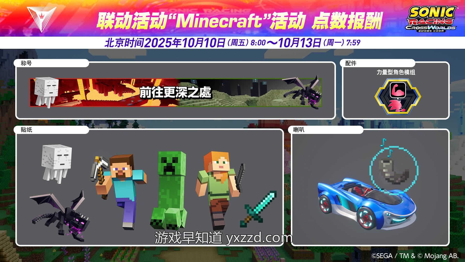 为纪念“Minecraft”DLC上线,《索尼克赛车 交叉世界》特别活动火热进行中。活动期间收集活动点数,特别的报酬等你来领。