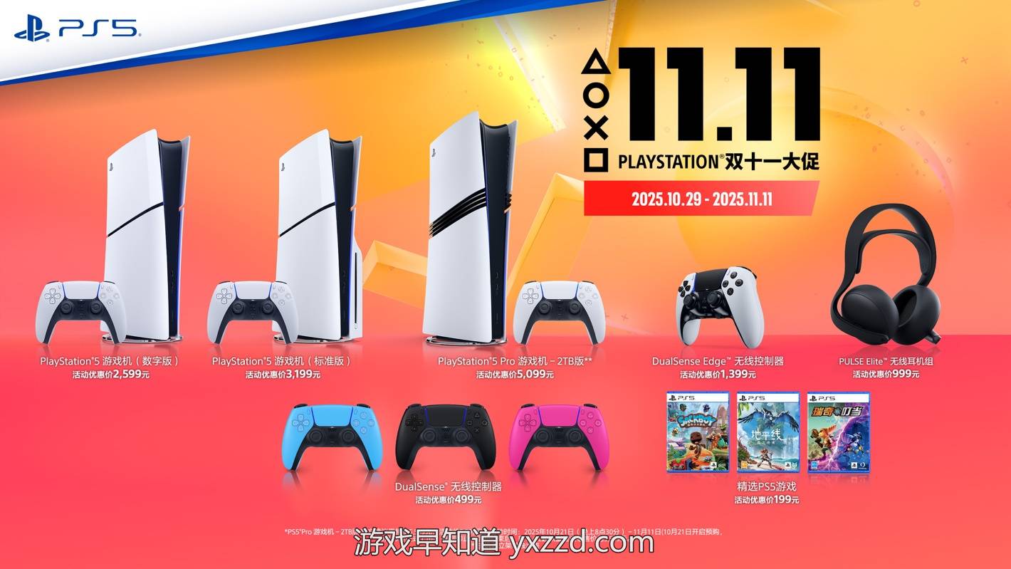 在今年双十一促销活动期间,PlayStation也为广大玩家带来家用游戏主机及主机周边设备的多种优惠选购方案。10月21日晚20:30至11月11日晚23:59:59促销活动期间:PlayStation®5 Pro享活动优惠价5,099元;PlayStation®5 主机标准版(轻薄版)活动优惠价3,199元,PlayStation®5主机数字版(轻薄版)活动优惠价2,599元;DualSense®无线控制器活动优惠价499元(限定版除外)。其他配件如PULSE Elite™无线耳机组活动优惠价999元 ,DualSense Edge™无线控制器活动优惠价1,399元。经典游戏《地平线 西之绝境™》《瑞奇与叮当:时空跳转™》和《麻布仔大冒险™》活动优惠价均为199元,详情请见各线上平台官方店铺说明。