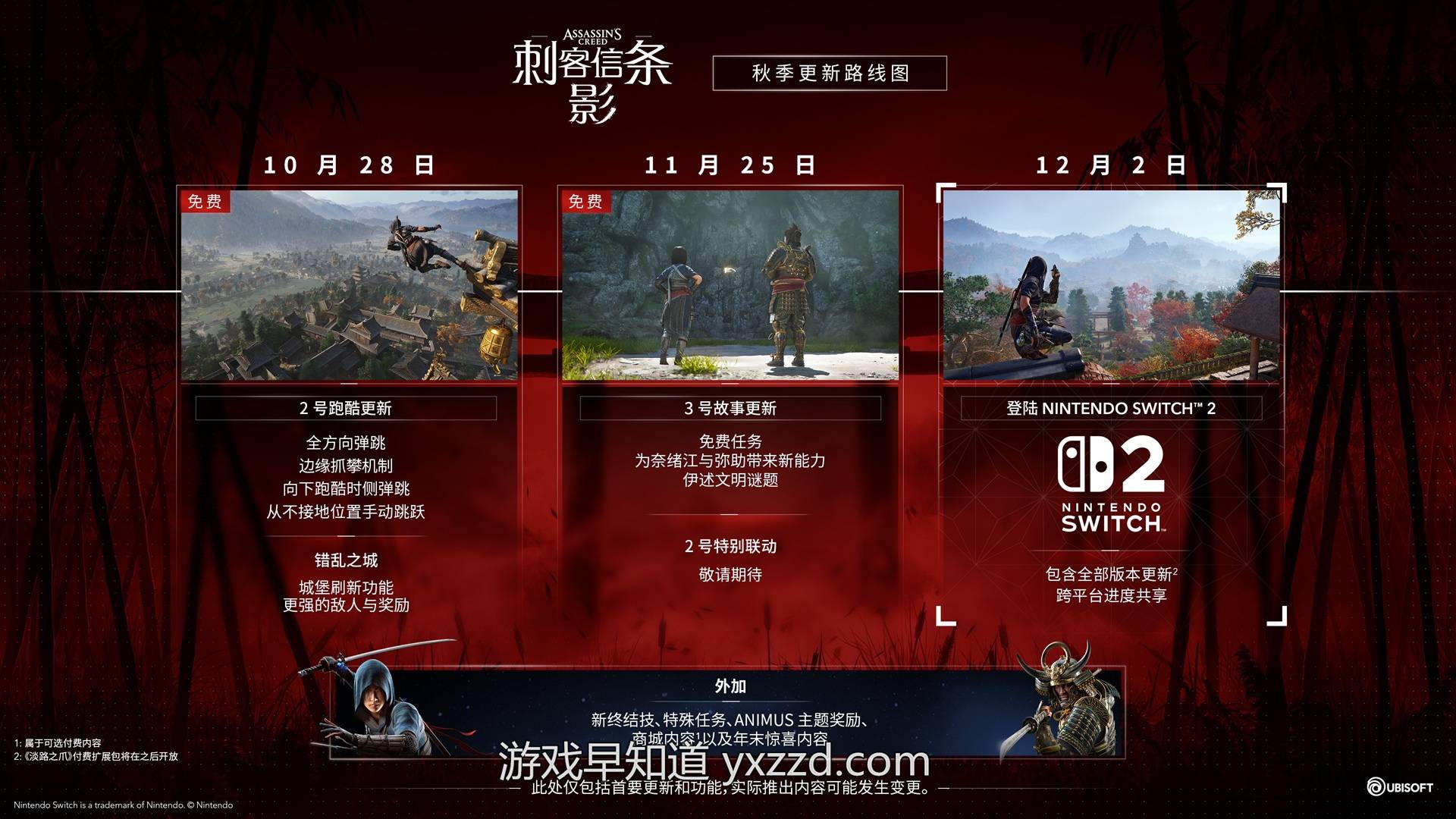 《刺客信条:影》将于12月2日正式登陆Nintendo Switch™ 2 平台!除了DLC《淡路之爪》将于新一年的晚些时候发布外,《刺客信条:影》Nintendo Switch 2版将包含所有近期的更新及免费内容。它还支持Ubisoft Connect跨平台进度功能,这样玩家就可以随时从上一次中断的地方继续游戏。《刺客信条:影》Nintendo Switch 2版还将提供全新的游戏方式,所有的菜单(包括世界地图、商店以及藏身处)都支持触屏操作。