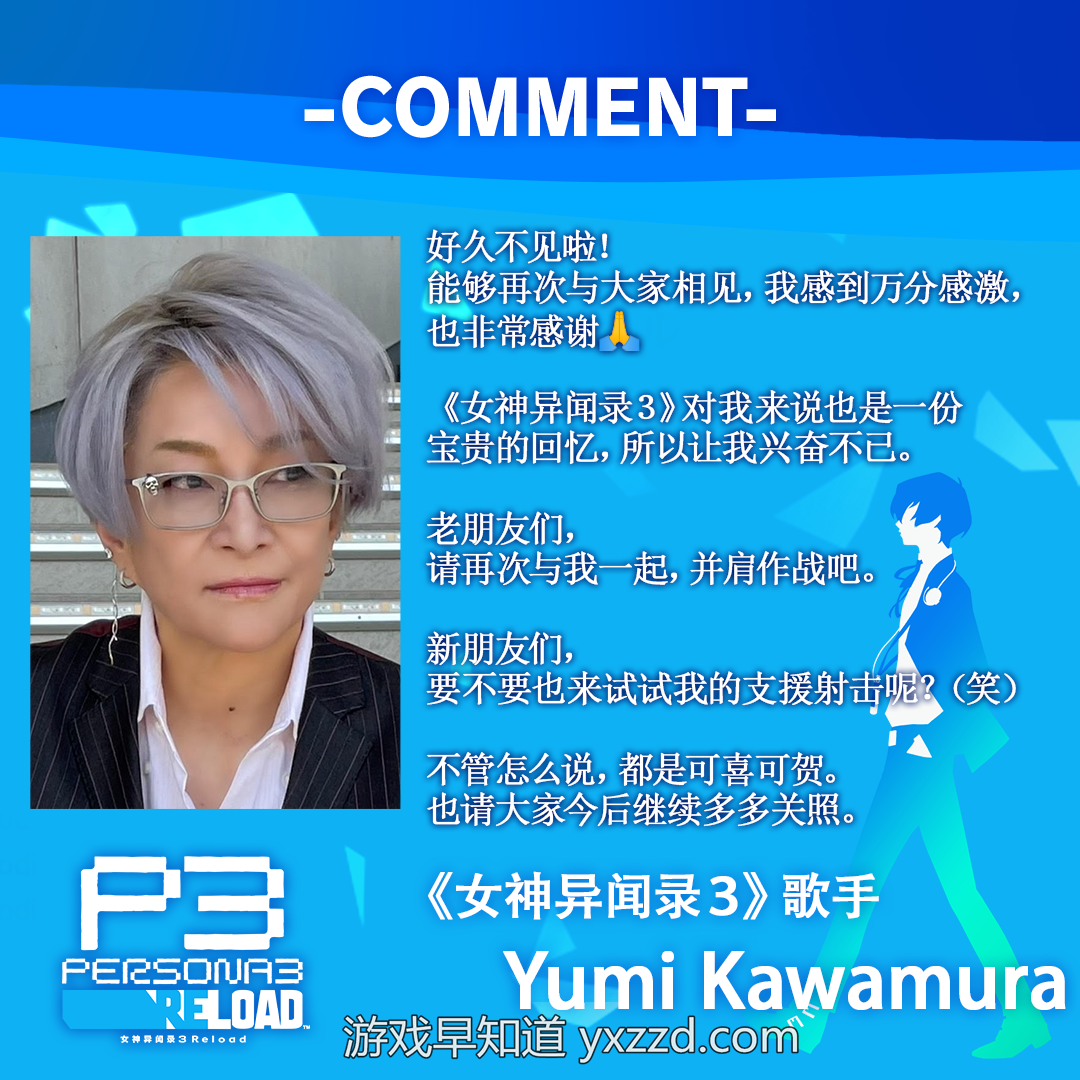 《女神异闻录3 Reload》歌手特别寄语视频:https://www.bilibili.com/video/BV1hdWYz4EfF?t=25.4