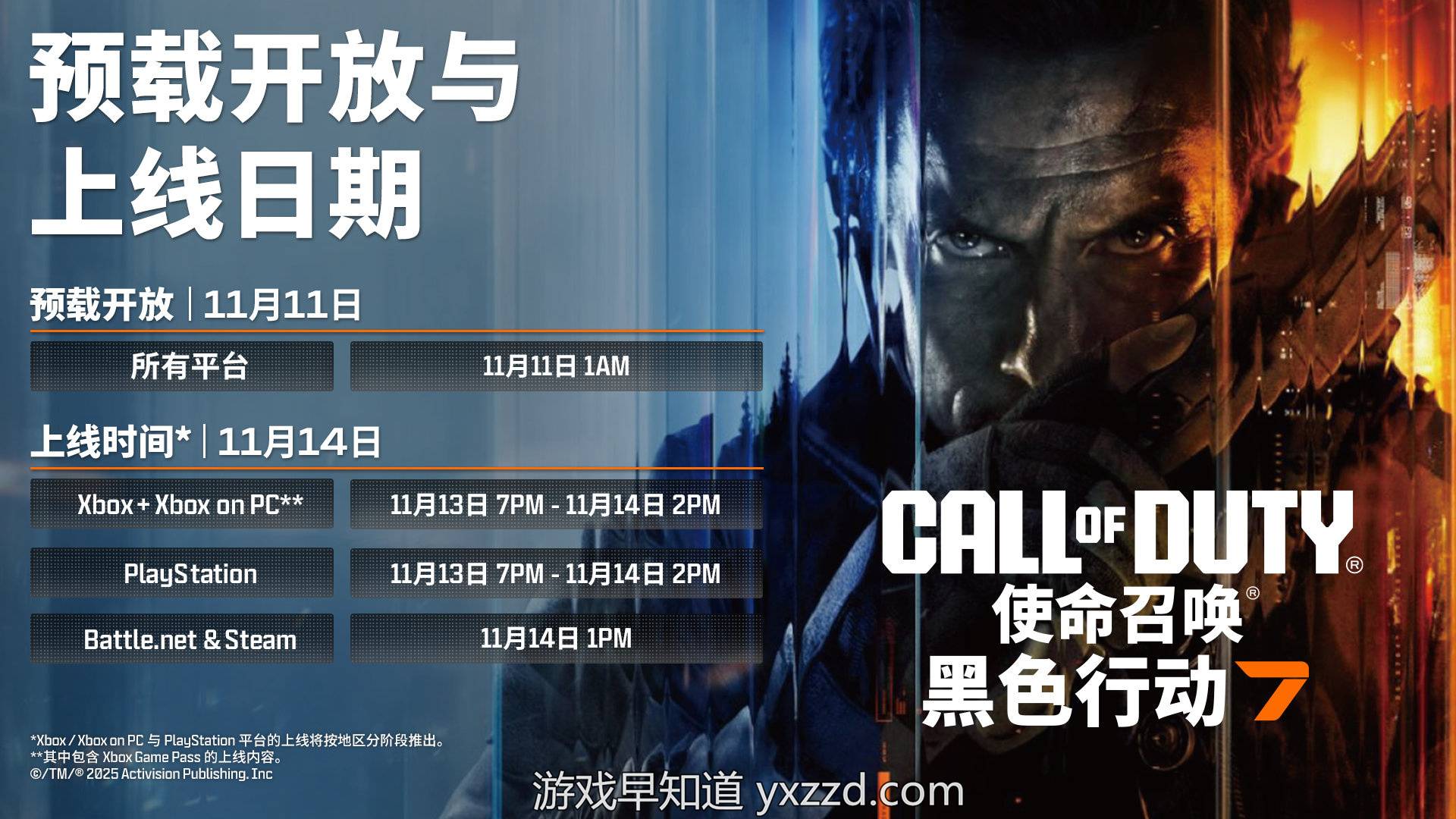 在电脑上数字预购《黑色行动 7》的玩家可提前预载游戏,确保在发行当天即刻畅玩。预载内容(包含合作剧情战役、多人游戏和僵尸模式)将于北京时间 11 月 11 日开启,完整游戏将于北京时间 11 月 14 日13点正式上线。