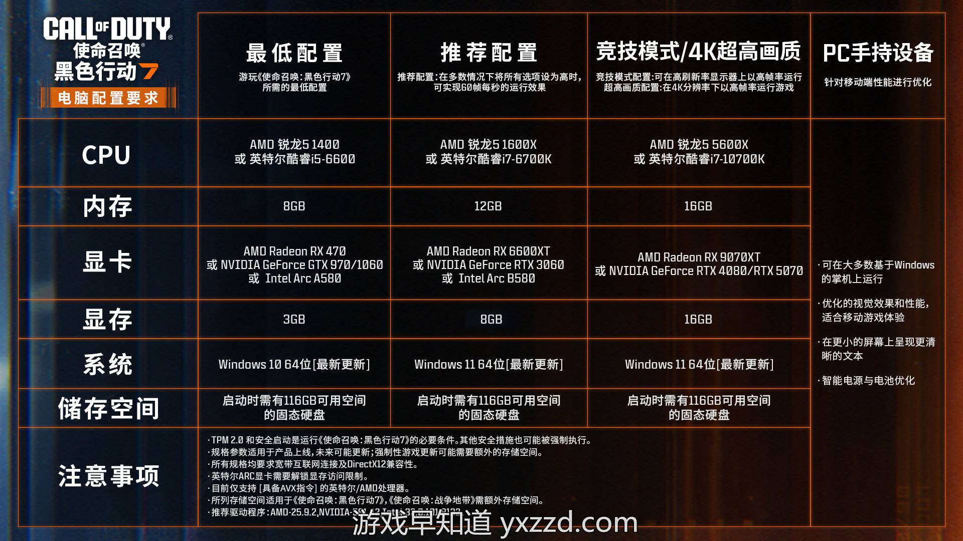 准备迎接《使命召唤:黑色行动 7》于 11 月 14 日在电脑平台的正式发行,官方已公布最低、建议、竞技/超高画质 4K 的硬件规格,此外还会提供预载时间、建议驱动程序,以及掌机版的功能预览,让你即使在行动中也能流畅游玩。