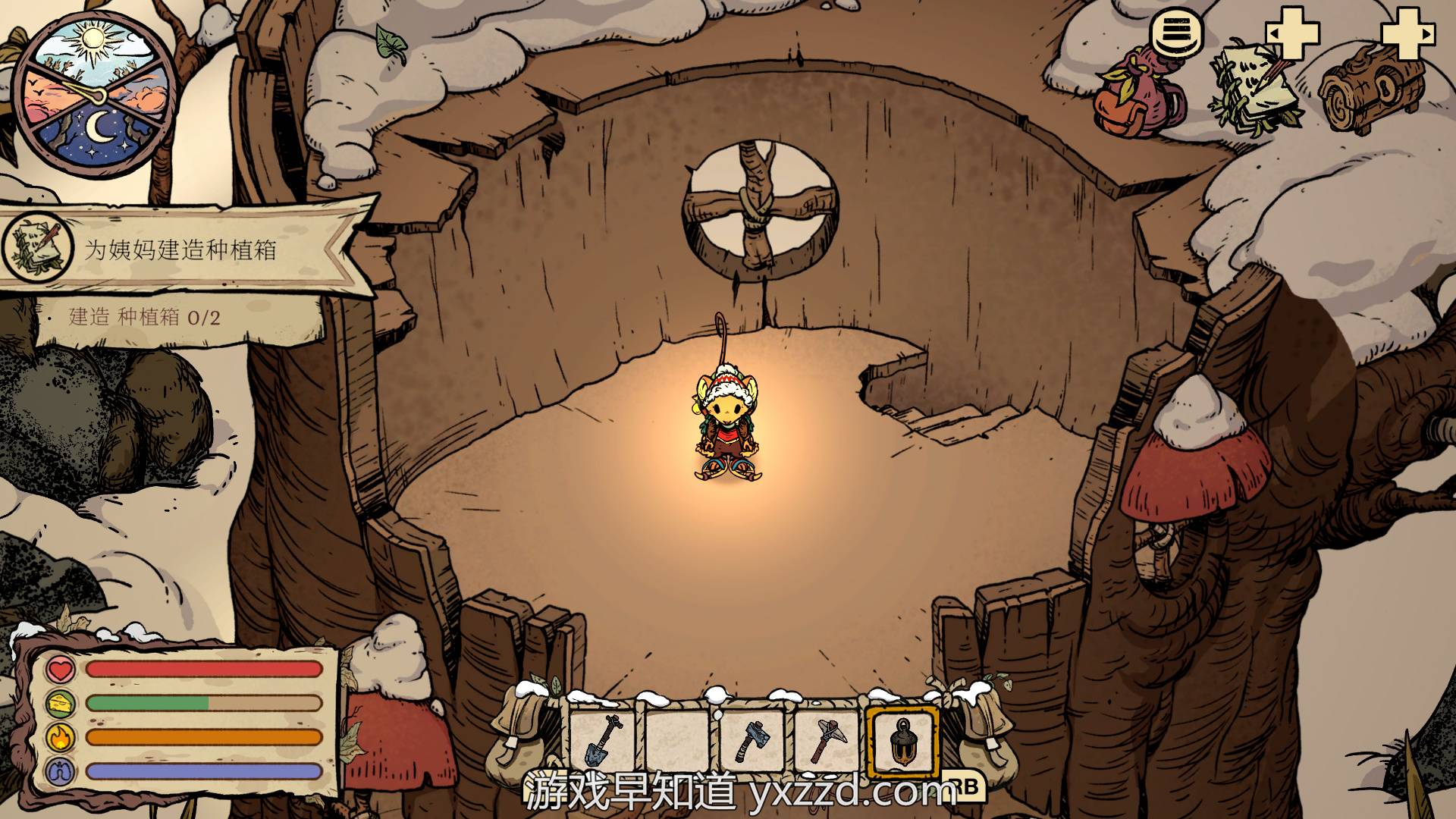 《林间暖巢》的生存系统包括了生命值、饥饿度、温暖度、体力值4个维度。在家里睡觉可以恢复生命值;吃各种料理可以恢复饥饿度;装备更好的防寒衣物可以让小老鼠在寒冷的野外停留时间更长;体力值则关系着砍伐与战斗的能力。保证物资充足,保持4维生存要求的稳定,是本作继续生存下去的关键所在。需要说明的是《林间暖巢》目前是没有提供难度选择的,不过体验下来游戏无论是生存还是战斗的难度并不算高,也并没有刻意的提高难度来营造生存的困难感。《林间暖巢》并不像其他生存游戏有着很强的生存压力和时间的紧迫感,反而给大家带来的整体体验节奏是相当松弛的。不过游戏中没有小地图,对于大家探索地图不是很友好。
