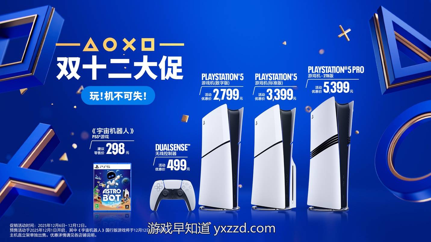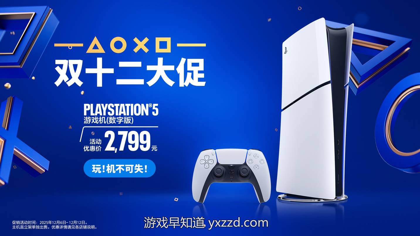 12月6日0时至12月12日晚23:59促销活动期间:PlayStation®5主机标准版(轻薄版)活动优惠价低至3,399元;PlayStation®5主机数字版(轻薄版)优惠价低至2,799元;PlayStation®5 Pro主机优惠价低至5,399 元。此外,DualSense®无线控制器也将于促销活动期间以优惠价499元限时发售(部分限定版除外)。12月1日0时起至12月5日晚23:59期间开启预售,更多优惠详情及预售商品发货时间请见各平台官方店铺信息。