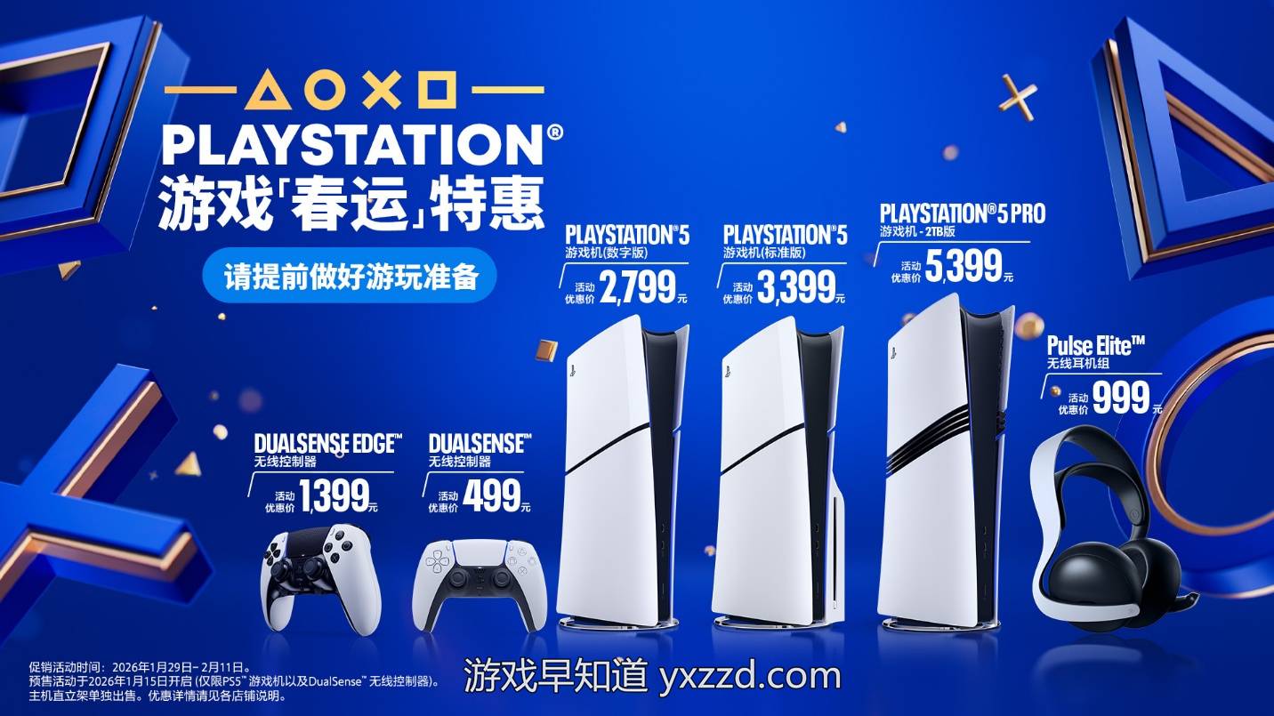 本次PlayStation年货节促销活动于2026年1月15日正式启动,持续至2月11日,期间多款产品将推出限定优惠:PlayStation®5 Pro惊喜价5,399元;PlayStation®5主机标准版(轻薄版)优惠价3,399元;PlayStation®5主机数字版(轻薄版)优惠价2,799元;DualSense®无线控制器优惠价499元,多色可选(限定版除外);DualSense EdgeTM无线控制器优惠价1,399元;PULSE EliteTM无线耳机组福利价999元。同时还有多款游戏参与促销,详情请见各平台官方店铺信息。1月15日0时起至1月28日晚23:59期间开启预售(仅限PS5TM游戏机以及DualSense®无线控制器),更多优惠及预售商品发货等具体信息,请以各平台官方店铺公布为准。