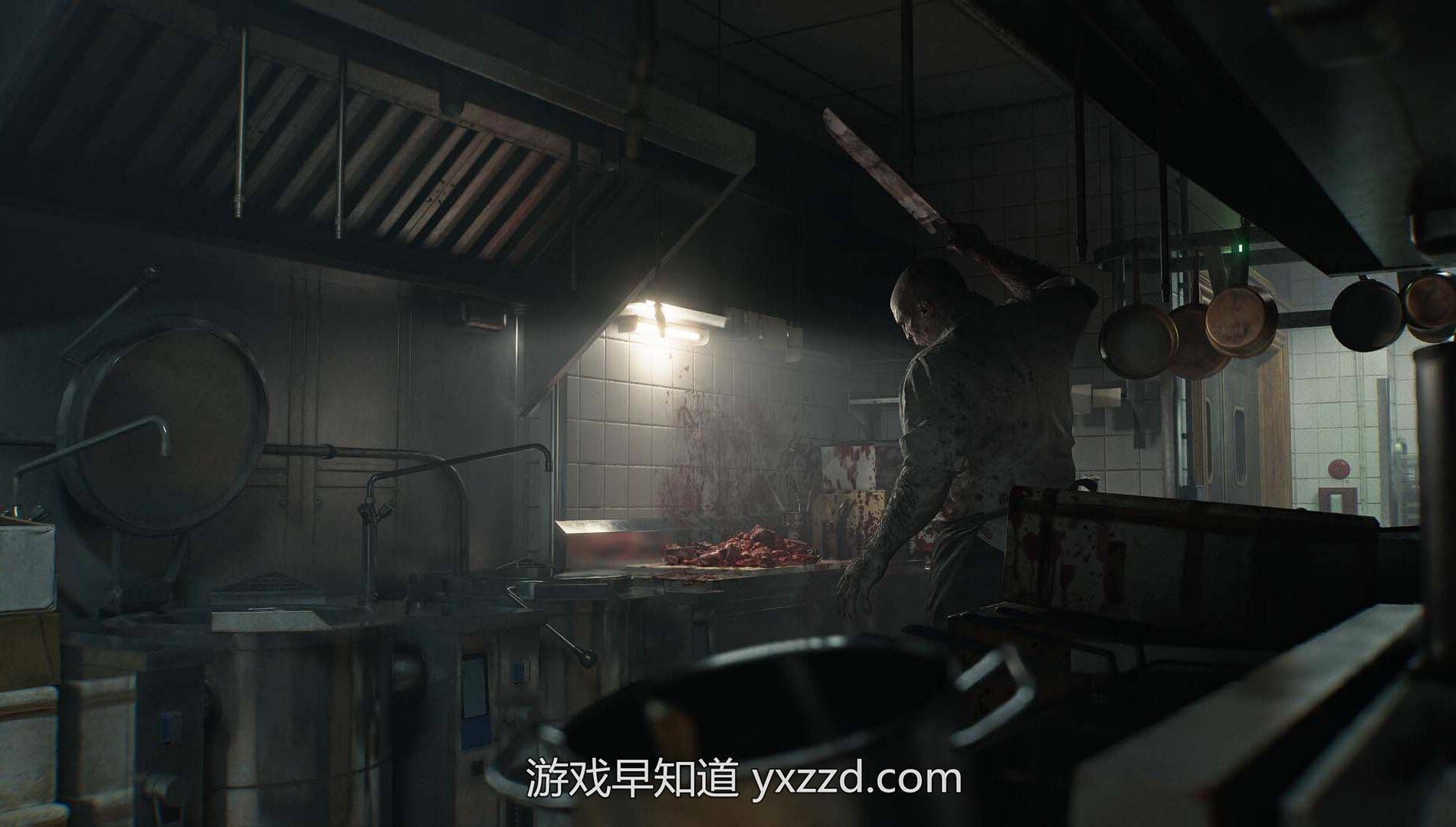 此外,厨房及相连走廊里还徘徊着一位身形魁梧的厨师,他正四处搜寻着肉块。最棘手的是,子弹似乎只能让他略感烦躁,唯一有效的应对方式就是避而远之。与《生化危机》前作中 X 先生或复仇女神这类贯穿全程的不可战胜威胁不同,《安魂曲》似乎设计了更多区域性恐怖元素。玩家首次遭遇这位厨师时,是在他自己的厨房里,当时只能屏息潜行通过;而当玩家推进流程、打开附近捷径后,他的活动范围虽有所扩大,却始终未曾踏出初始区域的周边地带。