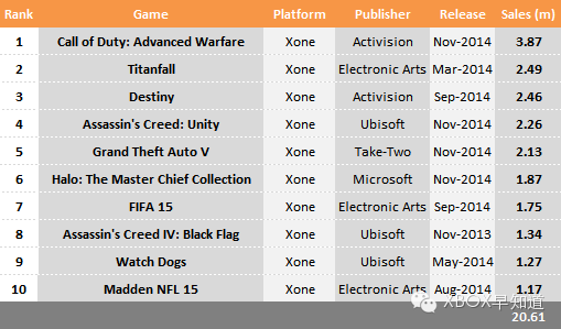 具体到游戏,2014年前3甲为《使命召唤:高级战争》《TitanFall》和《命运》,而育碧3款大作也都名列前十,分别是《刺客信条:大革命》《刺客信条:黑旗》和《看门狗》。在年度前十中只有一款是微软发行的第一方游戏就是《光环:士官长合集》。