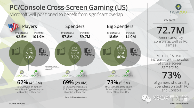 一款类似于Smartglass的Xbox App为什么会起到意想不到的作用?这就来源于XBox与PC玩家的分布与其消费能力,根据Newzoo的数据统计在美国有多达7200万玩家是主机与PC游戏都玩的,而其中750万玩家可以称得上土豪型玩家,他们既拥有主机和PC,而且出手大方,Xbox APP正是希望通过其跨平台的能力,吸引这部分玩家的目光。