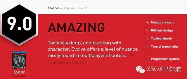 《进化》作为15年首款3A级大作,获得了欧美专业媒体的一致好评,继GameSpot给出8分之后,IGN在今天也公布了自己对于《进化》的测评,并给出了9分的高分。