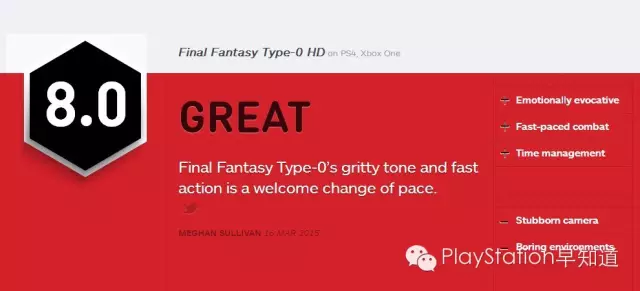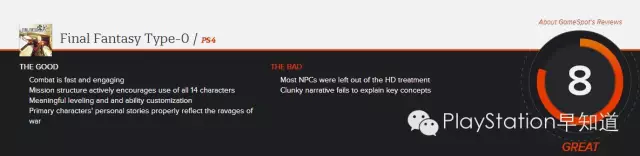 《最终幻想零式》目前PS4版的Metascore媒体评分为75分,而IGN,GameSpot和Polygon均一致的给出了80分的评价,作为一款从PSP平台重置而来的作品,这个分数已经不低。