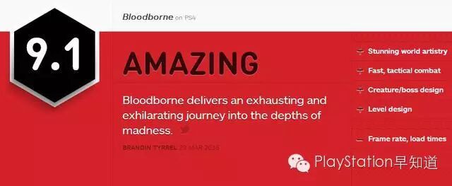 IGN方面在今天终于给出了自己的《血源诅咒BloodBorne》评分,基于该作超级过硬的素质,IGN的评分自然也没有让人感到意外,9.1分合情合理。